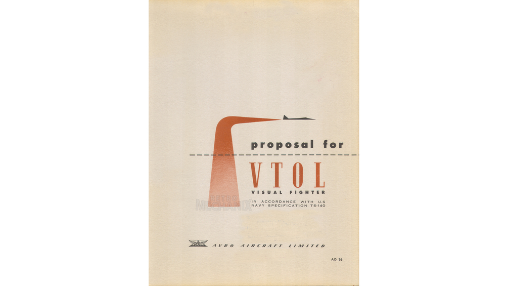 Back by popular demand! A PDF of the Avro Canada VTOL Fighter proposal brochure of October 1956, an aircraft designed to fulfill US Navy specification TS-140. It was a compact flat-rising canard-type with two pairs of low aspect ratio unswept wings. A Bristol Orpheus jet engine was mounted on each wing tip, the vertical thrust being being produced by jet deflectors in the engine tailpipes. This PDF is packed with artwork and detailed drawings documenting this unusual VTOL fighter design in great detail. In total, there are 73 pages of material with 29 pages of images (4 in color), the images being scanned at 150 DPI. (Please note that the images are lightly watermarked with the Retromechanix logo).
